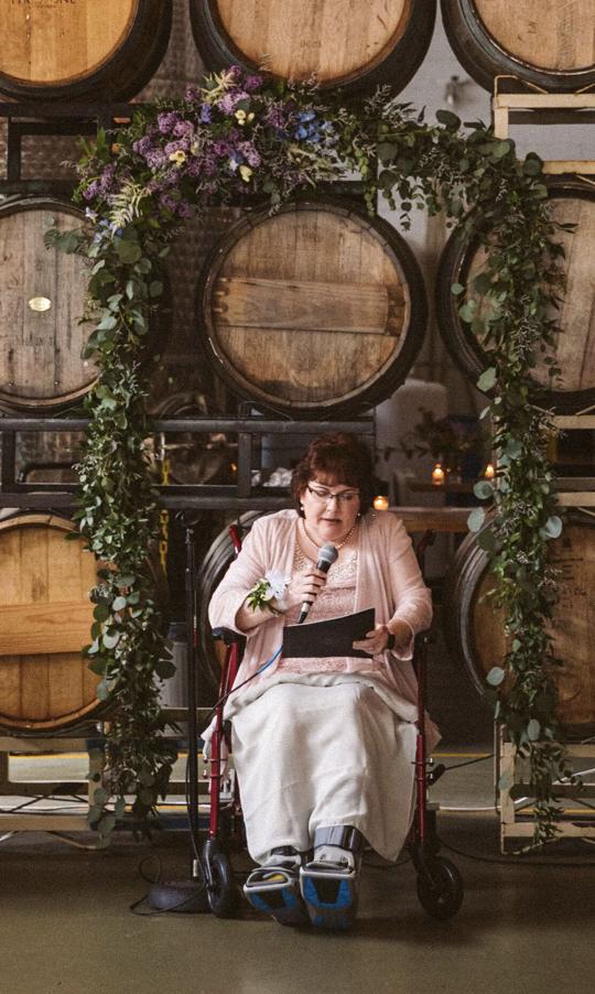 Baker was also determined to officiate her son’s 2022 wedding in the Pacific Northwest. While still in a wheelchair, recovering from an infection, and traveling cross-country with medical supplies, she made the trip to Oregon just seven weeks after the crash. She officiated the ceremony from her wheelchair, wearing the dress she bought long before the accident. “Missing my son’s wedding was not an option,” she says. “If there’s a will, there’s a way.”